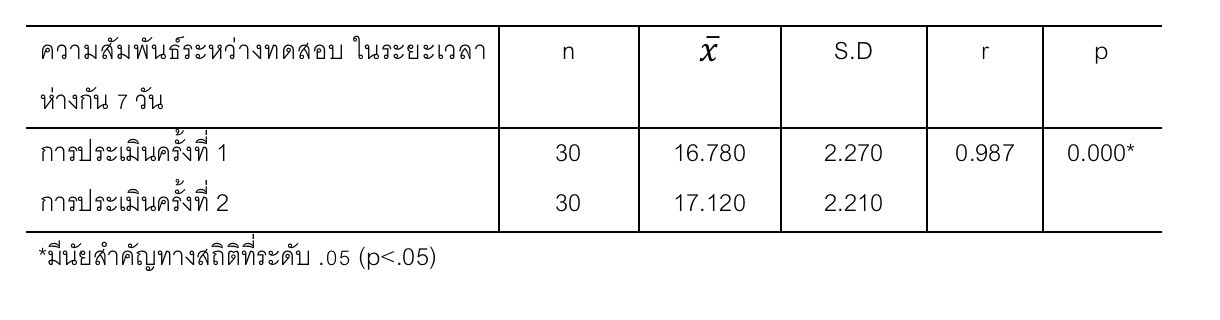 จากตาราง 2 พบว่าการทดสอบความสัมพันธ์ระหว่างทดสอบ ในระยะเวลาห่างกัน 7 วัน ในครั้งที่1 และ 2 มีค่าความสัมพันธ์ เท่ากับ 0.987 โดยผลการทดสอบชี้ให้เห็นค่าความสัมพันธ์ระดับสูงอย่างมีนัยสำคัญทางสถิติที่ระดับ 0.05
